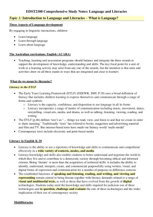 Comprehensive and detailed notes that incorporate all lecture and tutorial content. These notes are colour coded based on which topic it falls under and will be all you need to successfully pass your unit! Topics covered (all lectures is covered and definitions/terms are provided): - Module 1: Introduction to Language and Literacies - Module 2: Code-Breaking - Module 3: Meaning making - Module 4: Text use - Module 5: Text Critic