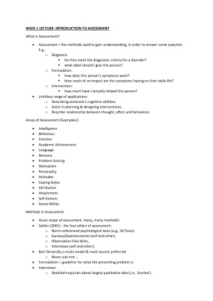 These notes include all lectures for the semester as well as the readings and tutorial notes. - very detailed notes - clearly set out Topics Included: - Introduction to Assessment - Clinical Assessment - Assessment Guide Intervention - Case Formulation - Norm-Referenced Tests - WAIS-IV and WISC-V - Evaluating Results - Communicating Results - Symptom Management - Cognitive Interventions - Behavioural Experiments - Behavioural Interventions