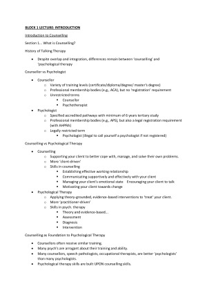 These notes include all lectures for the semester as well as the readings and tutorial notes. - very detailed notes - clearly set out Topics Included: - Introduction to Counselling - Rapport and Support - Understanding Your Client - Facilitating Change - Changes in Professional Helping - Helping Beyond Counselling - Counselling Variations: Counselling Contexts - Counselling Variations: Client Types
