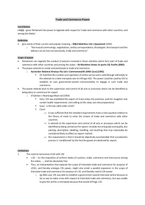 - Trade and Commerce Power - Corporations Power - Characterisation - External Affairs Power - Inconsistency of Laws - Executive Power (Prerogative & Spending Money) - Nationhood Power - S 80 Trial by Jury - Judicial Power under s71 - Separation of Power - Exceptions to Separation of power - Federalism & Intergovernmental Immunities - Acquisition of Property on Just terms under s 51(xxxi) - Implied Freedom of Political Communication - Freedom of Religion -