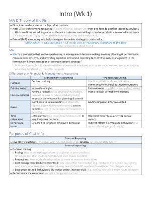 This doc has been compiled from the lectures. It contains the theory content needed for a 7. I scored 30/30 (full mark) for the mid-semester exam and received a 96/100 for the course (GPA 7). Content covered: >> Introduction to ACCT3104: costing systems, allocation of indirect costs, PVV, and inventory valuation methods (topic 1) >> Absorption, variable, and throughput costing. Capacity analysis. (topic 2) >> Inventory management, EOQ, and JIT (topic 3) >> Pricing decisions and cost management (topic 4) Note: aside from the theory content provided by this document, it is also important that you are able to do practical questions (see the tutorials) Good luck!
