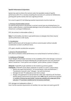 This set of detailed and structured notes are used to obtain a high HD in the Contract B Exam at the end of Semester 1 2022. Notes are written out in full (including introduction and conclusion), essentially acting as a template in the exam. Topics include: - Termination for breach - Termination for repudiation - Termination for Delay - Damages - Liquidated damages and penalties - Specific Performance and Injunctions - Action for Debt - Restitution - Frustration - Vitiating Factors - Third Party Impropriety - Rescission - Statutory unconscionability - Misleading or deceptive conduct - Remedies