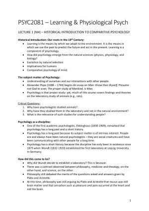 PSYC2081 - Learning and Physiological Psychology lecture notes Mark - HD Includes Weeks 1-10 Topics covered include: Historical introduction into comparative psychology, Pavlov and Skinner, associative learning, prediction error and conditioning, intro to human associative learning part 1 and 2, evaluative conditioning, attention and associative learning, schizophrenia and learning, motivation, addiction (introduction, theories and treatments), attachment (mother-infant, fathers, infant-mother, adult couples and unifying principles), neurobiology and interactions in Pavlovian conditioning, neurobiology in instrumental conditioning, Pavlovian to instrumental transfer (including neurobiology and interactions) and neurobiology in extinction of Pavlovian conditioning.