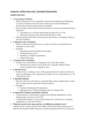 These notes are a set of comprehensive set of exam notes for the Administrative Law unit, and include the following topics: - General Introduction; - Government structure and separation of powers; - Non-judicial review; - The Ombudsman; - Freedom of Information; - Merit Review; - Judicial Review (including helpful diagrams); - SAT and AAT; - Delegated legislation; - Simple and procedural ultra vires; - Broad ultra vires; - Procedural Fairness; and - Remedies.