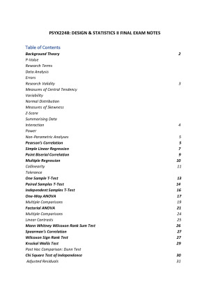 This booklet has everything you will need to study and will be your bible during the final exam! Everything I needed for the exam was in this booklet, it covers example questions, stata syntax, formulas, etc. Topics include: Background Theory P-Value Research Terms Data Analysis Errors Research Validity Measures of Central Tendency Variability Normal Distribution Measures of Skewness Z-Score Summarising Data Interaction Power Non-Parametric Analyses Pearson’s Correlation Simple Linear Regression Point Biserial Correlation Multiple Regression Collinearity Tolerance One Sample T-Test Paired Samples T-Test Independent Samples T-Test One-Way ANOVA Multiple Comparisons Factorial ANOVA Multiple Comparisons Linear Contrasts Mann Whitney Wilcoxon Rank Sum Test Spearman’s Correlation Wilcoxon Sign Rank Test Kruskal Wallis Test Post Hoc Comparison: Dunn Test Chi Square Test of Independence Adjusted Residuals
