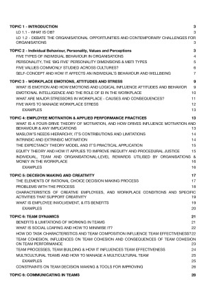 Covers all topics: 1. Introduction 2. Individual Behaviour, Personality, Values and Perceptions 3. WORKPLACE EMOTIONS, ATTITUDES AND STRESS 4. EMPLOYEE MOTIVATION & APPLIED PERFORMANCE PRACTICES 5. DECISION MAKING AND CREATIVITY 6. TEAM DYNAMICS & COMMUNICATING IN TEAMS 7. POWER AND INFLUENCE & CONFLICT & NEGOTIATION IN THE WORKPLACE 8. LEADERSHIP IN ORGANISATIONAL SETTINGS 9. ORGANISATIONAL CULTURE 10. ORGANISATIONAL CHANGE
