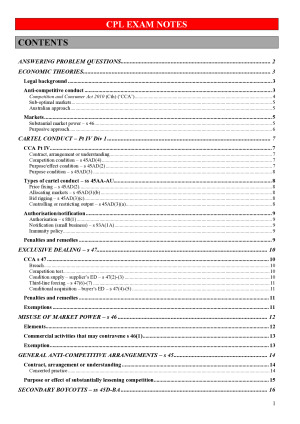 FULL LAW3CPL (Competition Policy and Law) NOTES FOR THE EXAM OR ASSIGNMENTS - Includes ALL information from lectures, seminars and readings from Wk 1-12 inclusive, a massive 25 pages of content perfect for the exam - typed, presented in clear, easy to see and easy to understand format with uniform headings, citations, case summaries, page numbers and graphs - contents page at the start - includes citations to ALL SOURCES, including legislation, cases and more in yellow, easily identifiable - all made by an A-grade student Take a look at the summary to see what subjects I go through and a quick preview of the first page.