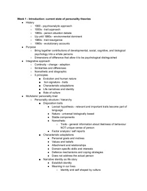 Wks 1-12 Lecture notes AND Tutorial notes Topics: Introduction: The current state of personality theories Personality & culture Traits & Evolutionary Psychology Personality disorders & culture Trauma & personality Dissociative Identity Disorder & culture A culture of narcissism? Psychopathy & culture The Dark Triad & Popular Culture Personality & Cyber-culture Personality & transcending the self