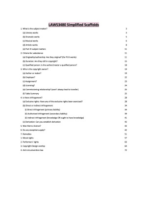 These are the simplified scaffolds for copyright that best and most simply allows you to approach problem questions. There is also a detailed version of these notes if you want materials for essays or more information about facts, judgment, etc. This is super EASY to read and navigate through. I have completed all the readings this semester to get the PINPOINTS you need that will give you the bonus marks in achieving that D/HD. These notes combine readings, cases and lecture notes. These sets of notes are well worth the investment and will save you a lot of time and trouble from reading cases and re-watching lectures. ✓ Succinct information ✓ Comprehensive ✓ Colour-coded for easy reading Light blue = key principle Pink = Cases Dark blue = legislation Red / bold = anything super key to point out Topics 1. Subsistence Criteria 2. Subject Matter 3. Ownership and Exploitation 4. Infringement 5. Economic Rights: Enumerated Rights 6. Authorisation of Infringement 7. Exceptions and Limitations 8. Other rights of creators and owners 9. Remedies for Infringement 10. Copyright-Design Overlap