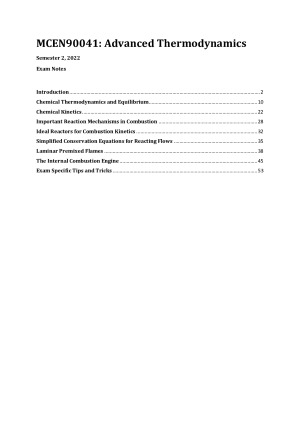 This set of notes will accompany you nicely whilst completing the subject MCEN90019 Advanced Thermodynamics, containing all the critical knowledge required to perform well in the exam. Included are notes for all of the sub-topics covered throughout the subject. Extra care has been taken to skim the unnecessary information from the lecture material, resulting in only the essential information required to perform well in the exam. Topics covered include: • Introduction • Chemical Thermodynamics and Equilibrium • Chemical Kinetics • Important Reaction Mechanisms in Combustion • Ideal Reactors for Combustion Kinetics • Simplified Conservation Equations for Reacting Flows • Laminar Premixed Flames • The Internal Combustion Engine • Exam Specific Tips and Tricks