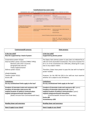 Short overview of how to structure questions. This is just a brief 6-page outline that gives how to structure a question, covering: - Corporations power - External affairs power - Defense Power - Taxation Power - Grants - State powers Then state and constitutional limitations including - Freedom of trade and commerce - Freedom of intercourse - Implied freedom of political communication - Implied intergovernmental Immunities - Excise s90 - Inconsistency s109 Please see my full notes that cover full cases and extensive answers.
