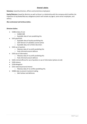 This is an extensive set of notes that has been compressed down into exam form, including cases with summaries and legislation, that covers all directors duties in corporate law with example exam answers. See my other notes for the other sections of the course. This includes: •S180(1) duty of care o S180(2) BJR o Equitable duty of care paralleling this. •S181 good faith o Equitable duty of loyalty paralleling this o S187 director of subsidiary section photo o Equitable duty not to fetter discretion •S182 use of position o Fiduciary duty of no profit paralleling this o Fully informed consent defense •S183 use of information o Fiduciary duty of no profit paralleling this o Fully informed consent defense •S184 criminal offense for use of position or use of information (photo at end) •S189 reliance •S190 delegation •S191 material personal interest o Fiduciary duty of no conflict paralleling this. •S588G duty to prevent insolvent trading o Safe harbour and defenses