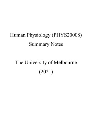 A complete set of notes for Human Phys covering all area of studies that you would ever need. It follows a topic-by-topic structure in chorological order of the lectures, summarizing concepts and definitions with succinct dot points and supplementary diagrams, with all information categorized into a hierarchy of topics and sub-topics. This is catered for the deadline fighters who simply want to Ctrl-F the whole subject with only one single document, the intellectually curious who are perhaps interested in getting ahead, and the study-holics who everything the lecture has covered to get that sweet H1 score. The 12-week contents of the summary notes include: 1. Homeostasis 2. Neural integration 3. Muscle 4. Nervous system and endocrine system 5. Respiration 6. Cardiovascular system 7. Renal function 8. Thermoregulation 9. Digestion 10. Reproduction Check out my summary notes for other level 1 to 3 science subjects on your right!