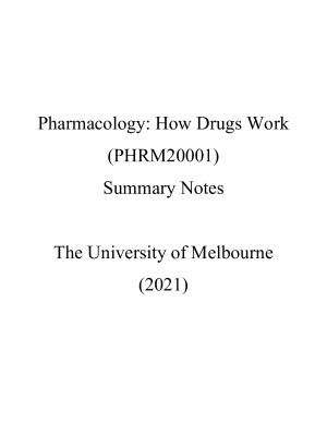 A complete set of notes for Pharmacology covering all area of studies that you would ever need. It follows a topic-by-topic structure in chorological order of the lectures, summarizing concepts and definitions with succinct dot points and supplementary diagrams, with all information categorized into a hierarchy of topics and sub-topics. This is catered for the deadline fighters who simply want to Ctrl-F the whole subject with only one single document, the intellectually curious who are perhaps interested in getting ahead, and the study-holics who everything the lecture has covered to get that sweet H1 score. The 12-week contents of the summary notes include: - Principles of Pharmacology - Therapeutic use of drugs - Pharmacology of CNS - Medicine from nature and harnessing toxicity Check out my summary notes for other level 1 to 3 science subjects on your right!