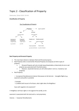 Detailed revision notes. This note covers all topics below: 1. Introduction to Property 2. Classification of Property 3. Tenure and Doctrine of Estates 4. Lease Covenants and Assignment of Lease 5. Land Transfer and Formalities 6. Adverse Possession 7. Easement 8. Profits a Prendre 9. Restrictive Covenant 10. Mortgages Used this for my exam and got a grade of 83. Final grade is 80.