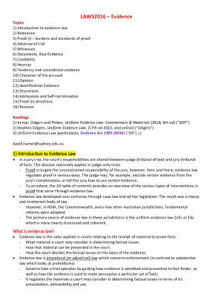 Very detailed notes for Evidence!!! Includes all course content (and everything you need for the final exam)! Super helpful for final exam revision Topics covered: 1) Introduction to evidence law 2) Relevance 3) Proof (i) – burdens and standards of proof 4) Adversarial trial 5) Witnesses 6) Documents, Real Evidence 7) Credibility 8) Hearsay 9) Tendency and coincidence evidence 10) Character of the accused 11) Opinion 12) Identification Evidence 13) Discretions 14) Admissions and Self-Incrimination 15) Proof (ii) directions 16) Revision (Exam Tips) Readings 1) Kumar, Odgers and Peden, Uniform Evidence Law: Commentary & Materials (2018, 6th ed) 2) Stephen Odgers, Uniform Evidence Law, (17th ed 2022) 3) Uniform Evidence Law (particularly, Evidence Act 1995 (NSW))