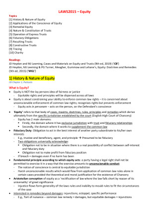 Excellent and super detailed final exam notes prepared by a High Distinction student. Super useful for final exam revisions Topics [1] History & Nature of Equity [2] Applications of the Conscience of Equity [3] Remedial Equity [4] Nature & Constitution of Trusts [5] Operation of Express Trusts [6] Fiduciary Obligations [7] Resulting Trusts [8] Constructive Trusts [9] Tracing [10] Charity Readings JD Heydon and MJ Leeming, Cases and Materials on Equity and Trusts (9th ed, 2019) JD Heydon, MJ Leeming & PG Turner, Meagher, Gummow and Lehane’s, Equity: Doctrines and Remedies (5th ed, 2015)