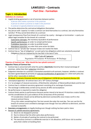 Excellent and super detailed final exam notes prepared by a Distinction student. Super useful for final exam revisions Topics: Introduction Agreement Certainty Consideration Intention to create Legal Relations and Formalities Estoppel Terms Construction Exclusion Clauses and Privity Discharge by Performance and by Acceptance Discharge for Breach and Repudiation Process and Effect of Termination and Discharge by Frustration