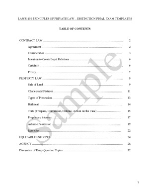 LAWS1150 Comprehensive DISTINCTION Final Exam Templates These distinction notes summarise all of the topics in the LAWS1150 Principles of Private Law course. All references to relevant case authority and legislation have been provided (with key quotes) and all information is organised under clear headings making the document easy to navigate. Topics covered include: - Contract Law - Property Law - Equitable Estoppel - Agency