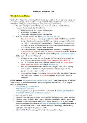 This is a succinct set of summary notes for the entire course (weeks 1-13). These notes are crucial for the end-of-semester exam, which I achieved 81%. I have included all key definitions and relevant case studies across the content. Weekly topics: Week 1: - Introduction to the unit: how do we integrate the environmental, social, cultural, economic, and political? - What is nature? Week 2: - Indigenous and local environmental knowledges and management - What is natural resource management? Protection versus sustainable use Week 3: - What is natural resource management? Policy and practice in Australia - What is natural resource management? Agriculture and NRM Week 4: - Capitalism and the environment: Opportunities, contradictions and limits - Capitalism and the environment: Ecosystem services and offsetting Week 5: - Bodies: population and scarcity - Bodies: environmental and social justice Week 6: - Field trip Week 7: - Oil, coal and the Petrostate: can we live with(out) them? - Energy and renewables: Can we engineer a sustainable grid for all? Week 8: - The international climate regime - Carbon markets and carbon farming Week 9: - Climate change, disasters and development - Managing environmental risk Week 10: - Commons and commoning: practicing collective action for collective good - Rights for nature and rights for humans Week 11: - Caring for Country and Indigenous enterprise development Week 12: - The regenerative agricultural revolution - Sustainable transitions and holistic thinking Week 13: - Nature based approaches to sustainable and resilient development - Conclusion and exam preparation