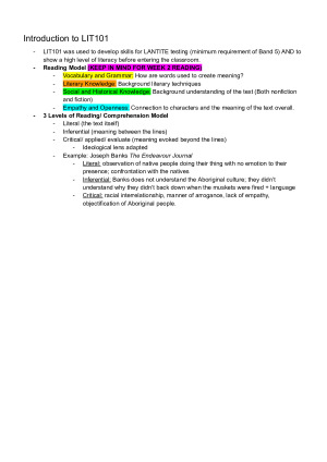 Topics: - Introduction to LIT101 - Contact and Differing Worldviews - Australian Vernacular - Australian Gothic - Evoking place and feelings - Describing Feelings About Home and Identity - Autobiography - Lyric Poetry - Picture Books: The Grammar of Visual Texts - Reading Plays: What Makes Writing Dramatic?