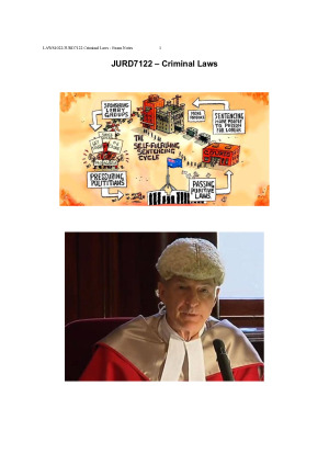 These notes were written by a student who achieved a mark of '85' in the course and won the Juris Doctor Medal. They are comprehensive, written in bullet point form, and clearly indexed by topic. They include summaries of the relevant cases in catchword form (clearly articulating the principle that each case stands for). At the time the author took this course, the textbook was: A Steel, A Loughnan, L McNamara, M Grewcock, D Brown, D Farrier, J Quilter, M Schwartz and T Anthony, Criminal Laws (7th edition) The topics covered are: 1. Assault Offences 2. Sexual Assault 3. Murder and Manslaughter 4. Dishonest Acquisition Offences 5. Extended Liability: Complicity and Conspiracy 6. Defences in Criminal Law 7. Theory Topics (including article summaries)