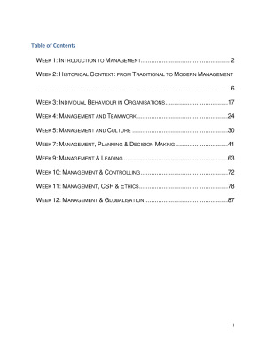 Covers all topics in course - INTRODUCTION TO MANAGEMENT - HISTORICAL CONTEXT: FROM TRADITIONAL TO MODERN MANAGEMENT - INDIVIDUAL BEHAVIOUR IN ORGANISATIONS - MANAGEMENT AND TEAMWORK - MANAGEMENT AND CULTURE - MANAGEMENT, PLANNING & DECISION MAKING - MANAGEMENT & LEADING - MANAGEMENT & CONTROLLING - MANAGEMENT, CSR & ETHICS - MANAGEMENT & GLOBALISATION
