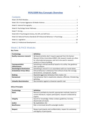 Hello! Thanks for checking out my notes. I received a mark of 83 for this subject. My grades across all subjects average within the top 1% of my cohort and my WAM is 90. I created this overview so that you can revise the core content and test yourself by covering the answers as you read through the worksheet. Note that anything in *red font* is very important to remember for the final exam! This overview of the unit covers: Week 2 & PACE Modules Week 3 & 4: Human Aggression & Media Violence Week 5: Internet Pornography Week 6: Psychology Career Pathways Week 7: Driving Week 8 & 9: Psychological Literacy, the APS, and Self-Care Week 10: National Practice Standards & Professional Behaviour in Psychology Week 11: Legislation Week 12: Professional Development