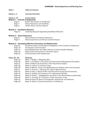 NURS5006 Lecture Notes and Readings. Module 1 — Theories of Subjectivity Module 2 — Qualitative Research Module 3 — Illness Experience Module 4 — Developing Effective Interactions and Relationships Weekly Readings.