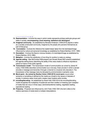97 (HD) IN MECO1001 FINAL EXAM** ALL YOU NEED TO KNOW cheat sheet will help you quickly identify, apply and analyse material with the relevant theoretical and conceptual frameworks under the tight exam timeframe(and guarantee you a HD!) Detailed & Comprehensive MECO theory notes split into two sections as per the exam format; Part 1: Comprehensive list of all media definitions/ theories/ theorists outline you need to know for the exam. Part 2: All key conceptual frameworks you need to know for the exam that are essential for analysis of news texts (Fiske etc) Enjoy!
