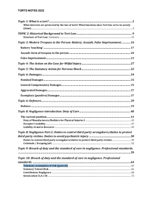 Torts Notes 2022 HD - Torts weeks 1-12 - Covers intentional torts -- assault, battery, false imprisonment and action on the case - damages for those torts - Negligence -- duty of care categories, defences, damages - Includes outlines of cases read in a table at the bottom below the notes - extensive referencing according to AGLC to help with assignments