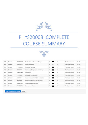 Attention all PHYS20008 students! Are you tired of spending countless hours every semester producing lecture notes at the expense of actually engaging with the course content? This summary is designed to save your precious time and money by condensing an entire semester's worth of textbook readings, lectures, workshops and supplementary resources into a single, summary document 😉 *𝐓𝐡𝐞𝐬𝐞 𝐧𝐨𝐭𝐞𝐬 𝐡𝐚𝐯𝐞 𝐛𝐞𝐞𝐧 𝐮𝐩𝐝𝐚𝐭𝐞𝐝 𝐟𝐨𝐫 𝐭𝐡𝐞 𝐜𝐮𝐫𝐫𝐞𝐧𝐭 𝐬𝐲𝐥𝐥𝐚𝐛𝐮𝐬, 𝐰𝐡𝐢𝐜𝐡 𝐰𝐚𝐬 𝐢𝐧𝐭𝐫𝐨𝐝𝐮𝐜𝐞𝐝 𝐢𝐧 𝟐𝟎𝟐𝟎* What is included? ✅ A concise summary of all 36 lectures ✅ Summarised textbook readings that have been integrated with lecture content ✅ Self-made revision questions (with answers) to test your understanding as you work through subject content ✅ Key words and terminology, making it Ctrl + F friendly for exams ;) Wishing you the best of luck for PHYS20008! 𝐈𝐧𝐭𝐫𝐨𝐝𝐮𝐜𝐭𝐢𝐨𝐧 𝐭𝐨 𝐏𝐡𝐲𝐬𝐢𝐨𝐥𝐨𝐠𝐲 𝐚𝐧𝐝 𝐍𝐞𝐮𝐫𝐨𝐧𝐚𝐥 𝐂𝐨𝐦𝐦𝐮𝐧𝐢𝐜𝐚𝐭𝐢𝐨𝐧 Lecture 1: Homeostasis Lecture 2: Neural integration 1 Lecture 3: Neural integration 2 Lecture 4: Neural integration 3 Lecture 5: Neural integration 4 Lecture 6: Neural integration 5 𝐌𝐮𝐬𝐜𝐥𝐞 𝐏𝐡𝐲𝐬𝐢𝐨𝐥𝐨𝐠𝐲 Lecture 7: Motor Control and Nerve/Muscle Integration Lecture 8: Skeletal Muscle 1 Lecture 9: Skeletal Muscle 2 Lecture 10: Cardiac and Smooth Muscle 𝐀𝐍𝐒 𝐏𝐡𝐲𝐬𝐢𝐨𝐥𝐨𝐠𝐲 Lecture 11: Autonomic Nervous System 𝐄𝐧𝐝𝐨𝐜𝐫𝐢𝐧𝐞 𝐏𝐡𝐲𝐬𝐢𝐨𝐥𝐨𝐠𝐲 Lecture 12: Endocrine System 𝐑𝐞𝐬𝐩𝐢𝐫𝐚𝐭𝐨𝐫𝐲 𝐏𝐡𝐲𝐬𝐢𝐨𝐥𝐨𝐠𝐲 Lecture 13: Respiration 1 Lecture 14: Respiration 2 Lecture 15: Respiration 3 Lecture 16: Respiration 4 𝐂𝐚𝐫𝐝𝐢𝐨𝐯𝐚𝐬𝐜𝐮𝐥𝐚𝐫 𝐏𝐡𝐲𝐬𝐢𝐨𝐥𝐨𝐠𝐲 Lecture 17: Properties of the Cardiovascular System Lecture 18: The Cardiac Cycle Lecture 19: Blood Pressure and its Regulation Lecture 20: Cardiovascular Challenges 𝐑𝐞𝐧𝐚𝐥 𝐏𝐡𝐲𝐬𝐢𝐨𝐥𝐨𝐠𝐲 Lecture 21: Renal Function 1 Lecture 22: Renal Function 2 Lecture 23: Renal Function 3 Lecture 24: Renal Function 4 𝐓𝐡𝐞𝐫𝐦𝐨𝐫𝐞𝐠𝐮𝐥𝐚𝐭𝐢𝐨𝐧 Lecture 25: Thermoregulation 1 Lecture 26: Thermoregulation 2 𝐃𝐢𝐠𝐞𝐬𝐭𝐢𝐨𝐧 Lecture 27: Digestion 1 Lecture 28: Digestion 2 Lecture 29: Digestion 3 𝐌𝐞𝐭𝐚𝐛𝐨𝐥𝐢𝐬𝐦 𝐚𝐧𝐝 𝐍𝐮𝐭𝐫𝐢𝐭𝐢𝐨𝐧 Lecture 30: Metabolism and Nutrition 1 Lecture 31: Metabolism and Nutrition 2 Lecture 32: Metabolism and Nutrition 3 𝐑𝐞𝐩𝐫𝐨𝐝𝐮𝐜𝐭𝐢𝐯𝐞 𝐏𝐡𝐲𝐬𝐢𝐨𝐥𝐨𝐠𝐲 Lecture 33: Gametogenesis Lecture 34: Pregnancy and Birth