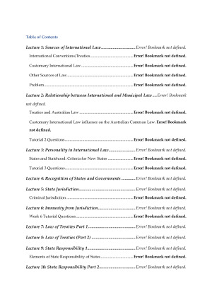 My Sample contains the table of contents as well as one of my exam scaffolds. This will hopefully give you a guide of how helpful these notes are. These notes were fundamental to my success in Public International Law (85 exam result). 40,358 words may seem like a lot but they are a comprehensive set of notes that are organized in an effective manner to ensure you can quickly locate information during the take-home exam. Our exam was a 3-hour take-home exam, which meant it was extremely important to have detailed scaffolds of each topic to answer the problem questions as easily and quickly as possible. I was able to achieve an 85 in the final exam, which was primarily due to my exam scaffolds and with these scaffolds, you will be one step closer to achieving this too. They have detailed explanations of each topic, including detailed case summaries and outlines of the relevant legislation. However, more significantly, they have detailed exam scaffolds for each topic. Topics covered include (see Table of Contents in the Preview for more detail): Sources of International Law - Relationship between International/Municipal Law - Personality & Recognition - Jurisdiction & Immunities - Law of Treaties - State Responsibility (including circumstances precluding wrongfulness and consequences) - Settling International Disputes - Use of Force - Exam Scaffolds