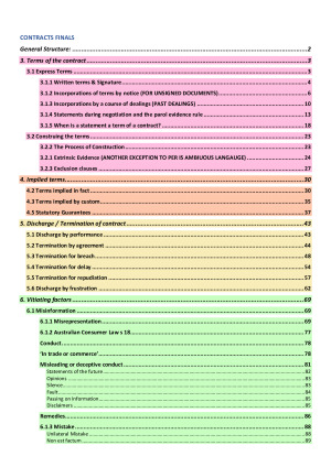 Guaranteed the BEST and ONLY set of EXTREMELY ORGANISED NOTES that you will need for the final exam!! These notes extensively COVER ALL TOPICS THAT CAN BE ASSESSED. These notes include: - readily available TEMPLATES for each topic that can be assessed in the exam which makes it easy to FINISH THE EXAM in the time period - the templates also include FORMATTING of how to STRUCTURE ANSWERS with all the KEY CASES being cited - TABLE OF CONTENTS for easy access to each topic during the exam - extensive CASE SUMMARIES of all the key cases at the end of each topic plus more which will distinguish you from others I promise these notes will NOT disappoint and are DEFINITELY worth the price. Topics covered include: • General Structure: o 3. Terms of the contract • Express Terms o Written terms & Signature o Incorporations of terms by notice (FOR UNSIGNED DOCUMENTS) o Incorporations by a course of dealings (PAST DEALINGS) o Statements during negotiation and the parol evidence rule o When is a statement a term of a contract? • Construing the terms o The Process of Construction o Extrinsic Evidence (ANOTHER EXCEPTION TO PER IS AMBIUOUS LANGAUGE) 20 o Exclusion clauses • 4. Implied terms o Terms implied in fact o Terms implied by custom o Statutory Guarantees • 5. Discharge / Termination of contract o Discharge by performance o Termination by agreement o Termination for breach o Termination for delay o Termination for repudiation o Discharge by frustration • 6. Vitiating factors o Misinformation  Misrepresentation  Australian Consumer Law s 18 • Conduct • ‘In trade or commerce’ • Misleading or deceptive conduct • Statements of the future • Opinions • Silence • Fault • Passing on Information • Disclaimers  Remedies  Mistake • Unilateral Mistake • Non est factum • Unilateral mistake in equity o Abuse of power  Duress  Undue influence  Unconscionable conduct  Statutory unconscionable conduct  Third party impropriety • 3rd party actual undue influence • 3rd party presumed undue influence o Wives' equity (Yerkley / Garcia) • 7. Introduction to remedies o Termination / Rescission o Election o Actions for debt Enjoy and good luck!! :)))