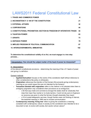 These are extremely comprehensive LAWS2011 Federal Constitutional Law Notes (over 48,000 words) with integrated scaffolds. These were the only notes I used throughout my study and I used them as scaffolds for the final exam. Benefits of these - I have done all the readings and marked important parts from judgements in bold. - Any italicised writing represents nuanced points or additional explanations from the lectures beyond the lecture notes. - The blue boxes indicate the step by step process of applying the law the integrated scaffolds - Blue highlight indicates the main point I got from each case - super details case summaries Topics included 1. TRADE AND COMMERCE POWER 2. INCONSISTENCY: S 109 OF THE CONSTITUTION 3. EXTERNAL AFFAIRS 4. CORPORATIONS 5. CONSTITUTIONAL PROHIBITION: SECTION 92 FREEDOM OF INTERSTATE TRADE 6. TAXATION POWER 7. GRANTS 8. DEFENCE POWER 9. IMPLIED FREEDOM OF POLITICAL COMMUNICATION 10. INTERGOVERNMENTAL IMMUNITIES