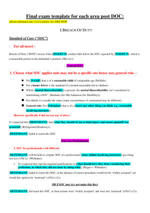 This provides you a full problem question outline template to use for LAWS1061, which helped me achieve my best mark at law school. This will help you greatly in your final exam. CONTENT INCLUDED: - private nuisance - negligence (categories of DOC, negligence, RF, DOC - physical injuries) - When does the CLA apply? - DOC mental injury - DOC third parties, occupiers' liability -DOC - PEL - DOC - public authorities - Breach of DOC - Causation of harm - Defences - concurrent liability -Damages - Tort of breach of a statutory duty