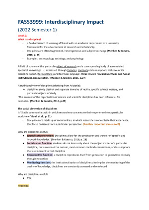 As this unit's main focus is group collaboration on a specific project/case study, this lecture summary will be useful in writing the end critical reflection assignment. The notes include quotes from each reading that could be directly used in the critical reflection. Week 1: What is a discipline? Week 2: Disciplinarity and Interdisciplinarity Week 3: Successfully bringing together diverse knowledge practices with LCT Week 4: Building interdisciplinary skills: collaboration and team dynamics Week 5: Complex Problems and Diverse Perspectives Week 8: Situated Knowledge and the Location of Expertise Week 9: Cultural Competence, Deep Listening and Interdisciplinary Collaboration No lecture notes for weeks 6, 7, 10, 11-13 as these were case study workshops and expert meetings