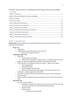 Hello and congrats on making it into Psychology Honours! :) I received a mark of 78 for this subject and graduated as the 2022 valedictorian for achieving the highest grade overall in my Honours year. I found my notes extremely helpful for revising for finals and hope that you will too! These notes include full summaries of the lectures, paraphrased in my own words for ease of understanding. The content is well organised by heading and subheadings covering main topics. The following topics are covered: Week 1: Introduction Week 2: A General Introduction to Abuse and Neglect Week 3: Parenting Week 4: Parenting II Week 5: Effects and Transmission Week 6: Prevention and Intervention Week 8: Child Sexual Abuse (CSA) Week 9: Child Witnesses of Interpersonal Violence Week 10: CSA Victims as Witnesses I Week 11: CSA Victims as Witnesses II Week 12: CSA Prevention and Intervention