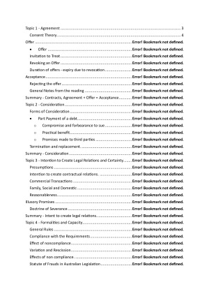 These study notes cover Topics 1 - 10, all cases are correctly cited; however, the case summaries are in a separate document. Topic 1 - Agreement Topic 2 - Consideration Topic 3 - Intention to Create Legal Relations and Certainty Topic 4 - Formalities and Capacity Topic 5 - Estoppel Topic 6 - Privity Topic 7 - Express Terms and Exclusion Clauses and Collateral Contracts Topic 8 - Parol Evidence rule, Construction of the terms and extrinsic evidence Topic 9 - Implied Terms Topic 10 - Frustration