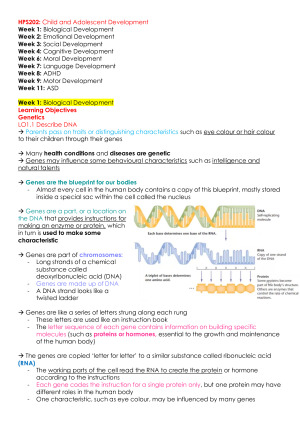This document contains EXTENSIVE notes of ALL the content to be learnt in HPS202. I have organised these notes into weekly topics that are further broken into weekly learning objectives (examinable). Information in this document is derived from the textbook (examinable pages), weekly lecture videos and seminar materials. Pictures and graphs are included throughout as well as coloured text for definitions helpful for visual learners! These notes were all that I needed to help me obtain a HD in HPS202. If you are going for psychology honours, marks in this unit count towards your WAM so give it your all! These notes relate to the following weekly topics (some weeks, WK5 and WK10, are dedicated to assessments): WK1: Biological Development WK2: Emotional Development WK3: Social Development WK4: Cognitive Development WK6: Moral Development WK7: Language Development WK8: ADHD WK9: Motor Development WK11: ASD