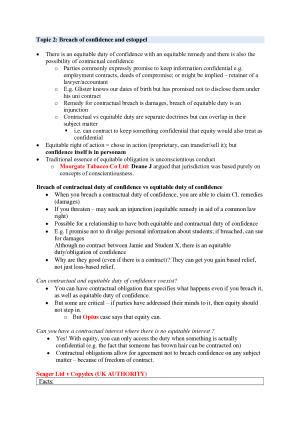 Comprehensive notes for Equity core unit at USYD. DISTINCTION notes: these notes are highly detailed, including case details and discussion of key principles. Covers: breach of confidence/estoppel, remedies, constitution and nature of trusts, operation of express trusts, fiduciary obligations, resulting trusts, constructive trusts