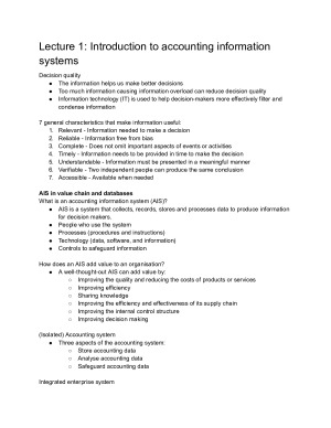 - Difficult unit and hard to find resources. A detailed notes document of all the topics from Week 1 to Week 12 (No new content for 13) - Notes cover all content required for weekly in-class activity, quizzes, assignments, presentation, and final exam - Lots of formulas to help and provide guidance when working on the assignments and good preparation for the final exam Topics Covered: - Introduction to accounting information systems - Business processes - ERP, CRM, and SCM - Internal Controls - Revenue Cycle - Expenditure Cycle - HR Management and Payroll Cycle - General Ledger (GL) and Financial Reporting Process - Systems Development - Acquiring Systems - Ethics and privacy - Documentation