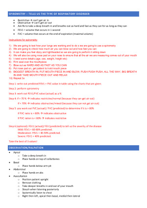 These notes cover all the assessable assessment skills required in exercise rehab. It includes a step-by-step instruction list for every assessment type, an explanation of results and a sample of the marking criteria used in Prac Vivas. The key topics in this document are: - Observation/Palpation - Ausculation - Spirometry - Peak Flow - Reading a CXR - Analysing a slide/observation - Reading an ECG - Pathophysiology behind common cardiorespiratory conditions
