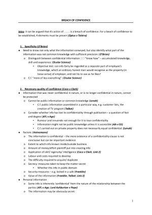 My exam notes contain all key case law or/ and legislations and cover all examinable topics including: - Confidentiality - Fiduciary duties and 3rd Party liability - Personal Remedies - Proprietary Remedies - Equitable Assignments & Constructive Trusts and Liens