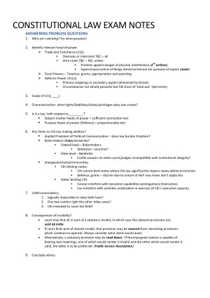 Notes for the exam. (or just understanding content throughout the semester). Breakdown and case summaries for each topic. Good luck you can do it! Topics covered: Constitutional Interpretation and Characterisation S 51(i) TRADE AND COMMERCE SECTION 51(vi) DEFENCE POWER (purpose) Fiscal Powers Taxation Power - s 51(ii) Grants Power - s 96 Appropriation and Spending – s81 & s83 Chapter III and Detention Implied freedom of political communication Intergovernmental Immunities Post 1920: State Parl binding the Cth Inconsistency – s109