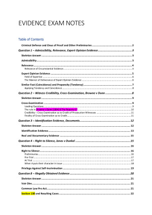 Notes on topics in Evidence Law Includes skeleton answers on the below topics TOPICS COVERED: - Admissibility - Relevance - Expert Opinion Evidence - Similar Fact (Coincidence) and Propensity (Tendency) - Witness Credibility - Cross-Examintion (incl Browne v Dunn rule) - Right to Silence & Privilege against Self-Incrimination (incl Jones v Dunkel rule) - Ilegally Obtained Evidence