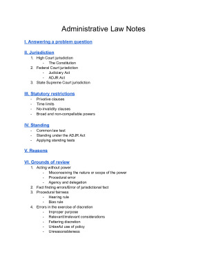 HD QUALITY ADMIN LAW NOTES The perfect, easy-to-follow scaffold for the judicial review problem question for the Admin Law final exam! Clear steps to follow to complete each element of the exam Colour coded so cases and legislation are easily found VERY DETAILED!!