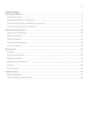 These detailed, high-quality notes for Mind, Brain and Behaviour 1 (MBB1) were crucial to me getting a grade of 98% for the subject. You will ace your exams with these notes. The notes cover: 1. Memory and Learning 2. Sensation and Perception 3. Neuroscience 4. All research methods modules 5. Strategies for getting straight H1s in assignments and exams -I have included hand-made diagrams to enhance understanding -The notes have been re-formatted so that they are aesthetic and easy to read. -BONUS - a section on my fool-proof method to getting straight H1s in Psychology. -Do not waste time making your own notes when you can have access to the best notes from a straight H1 student.