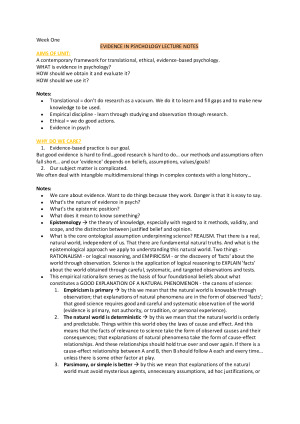 These are my final notes for the end of unit exam. I have organised them into the sections that the exam was split into as uploaded by Unit Chair. The topics covered include: - Key Definitions - Evidence in Psychology (Week One Lecture Notes) - The Scientific Method (Week Two Lecture Notes) - Threats to the Validity of Explanations of Psychological Phenomena (Week Three Lecture Notes, Module Notes + Seminar Notes) - Research Designs: Dealing with Threats to Validity (Week Four Lecture Notes + Module Notes) - Experimental Research Designs (Week Five Lecture Notes, Module Notes + Seminar Notes) - Observational Research Designs (Week Six Lecture Notes + Module Notes) - Qualitative Research Designs (Week Seven Lecture Notes, Module Notes + Seminar Notes) - Conducting Ethical Research in Psychology (Week Eight Lecture Notes + Module Notes) - Asking Questions in a Manner that is Reliable, Valid and Appropriate (Week Nine Lecture Notes, Module Notes + Seminar Notes) - Factorial Designs, Data Structures, and Effect Types (Week Ten Lecture Notes, Module Notes + Seminar Notes)