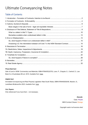 Topics Covered: 1: Introduction - Formation of Contracts; Intention to be Bound 2: Formation of Contracts - Enforceability 3: Options, Auctions & Deposits 4: Disclosure of Title Defects, Statement of Title & Requisitions 5: Error or Misdescription 6: Rescission & Termination 7: Restrictions, Notes, Inspections, Adjustments, Death, Insolvency, Possession, Insurance & Completion 8: Time/Date for Completion 9: Remedies 10: Real Estate Agency Answer guides on: - Legal and equitable interests at all stages of the sale - Defects in title - How cll 6 and 7 of the contract work together - Failure to complete